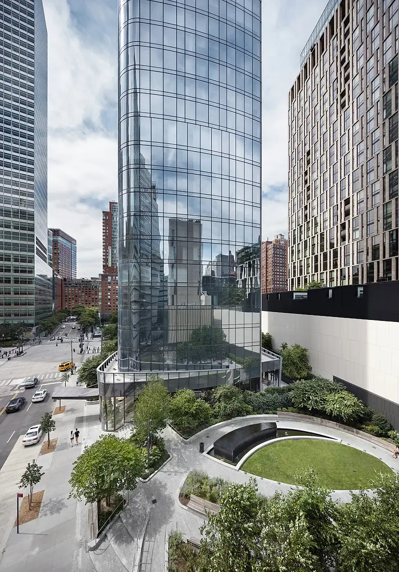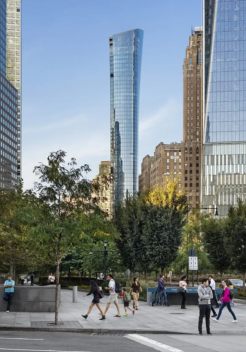 While introducing a new, prominent shape to the downtown skyline, 111 Murray also establishes itself within the neighborhood context. The building’s height mediates between the lower elevations of Tribeca and the towering structures of the World Trade Center area. Its exterior glass sheath, realized in two sections, wraps sinuously around the core and meets at the northwest and southeast corners. This “pinwheel” structure produces rounded corners at opposite ends, assisting the panoramic views at the top and softening the pedestrian experience at the street level. A public landscaped plaza combining a lawn, water fountain, and sculptures also engages passersby.